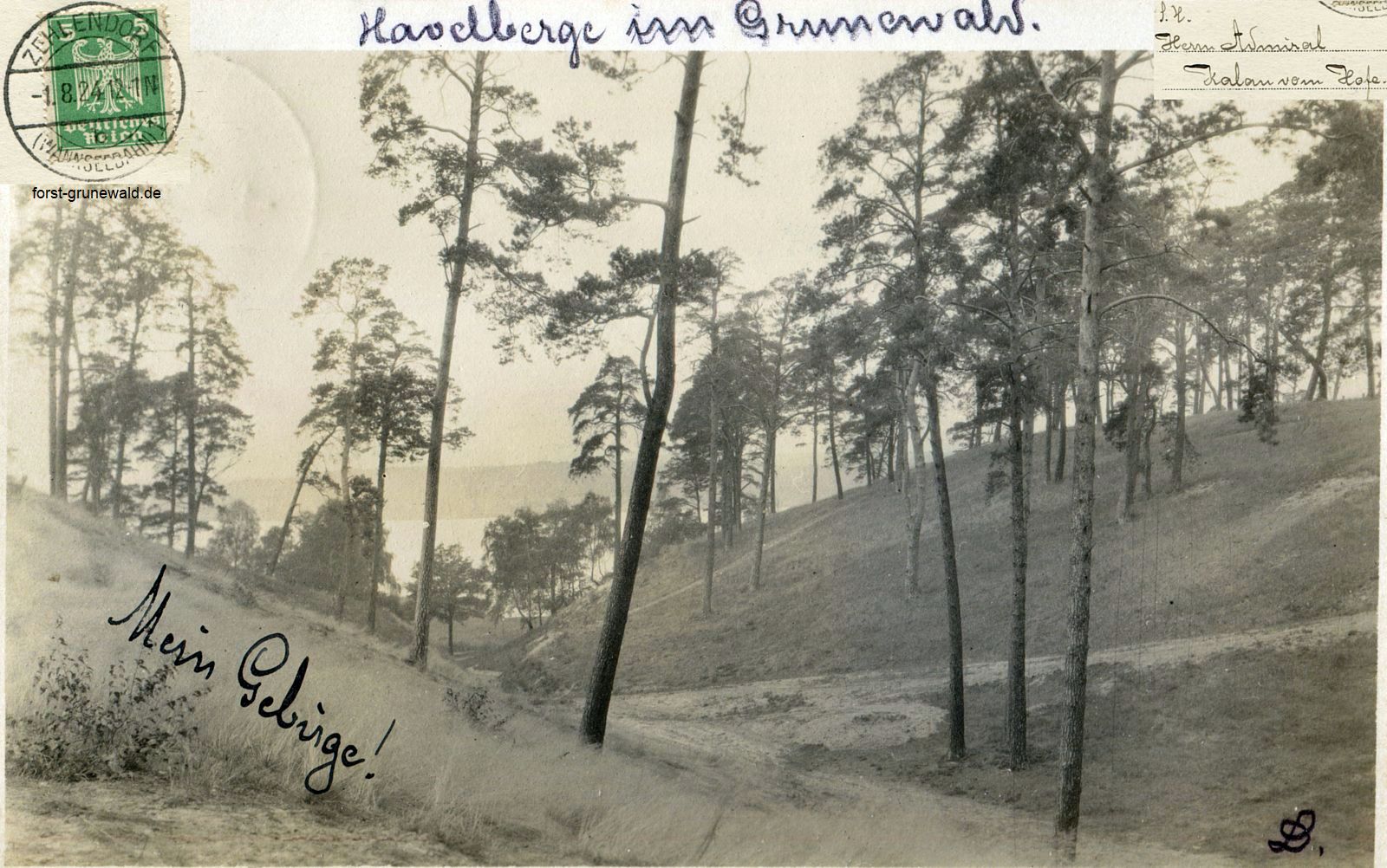 Hier noch eine nette Karte, postalisch gelaufen am 01.08.1924. Adressiert an Admiral Eugen Kalau vom Hofe, geschrieben von seinem Vetter. Ich dachte erst, es handelt sich um eine der Dachsbergschluchten. Aber das ist wohl falsch. An dieser Wegeinmündung treffen sich vorne rechts der Weg, welcher über ein Plateau von den Dachsbergeschluchten kommt, während der vordere Weg vom Grunewaldtum hinab führt. Nachdem sich beide Wege getroffen haben, mündet sie dann in wenigen Metern unten an der Nordseite der Lieper Bucht (bzw. dem Südhang des Karlsbergs). |
