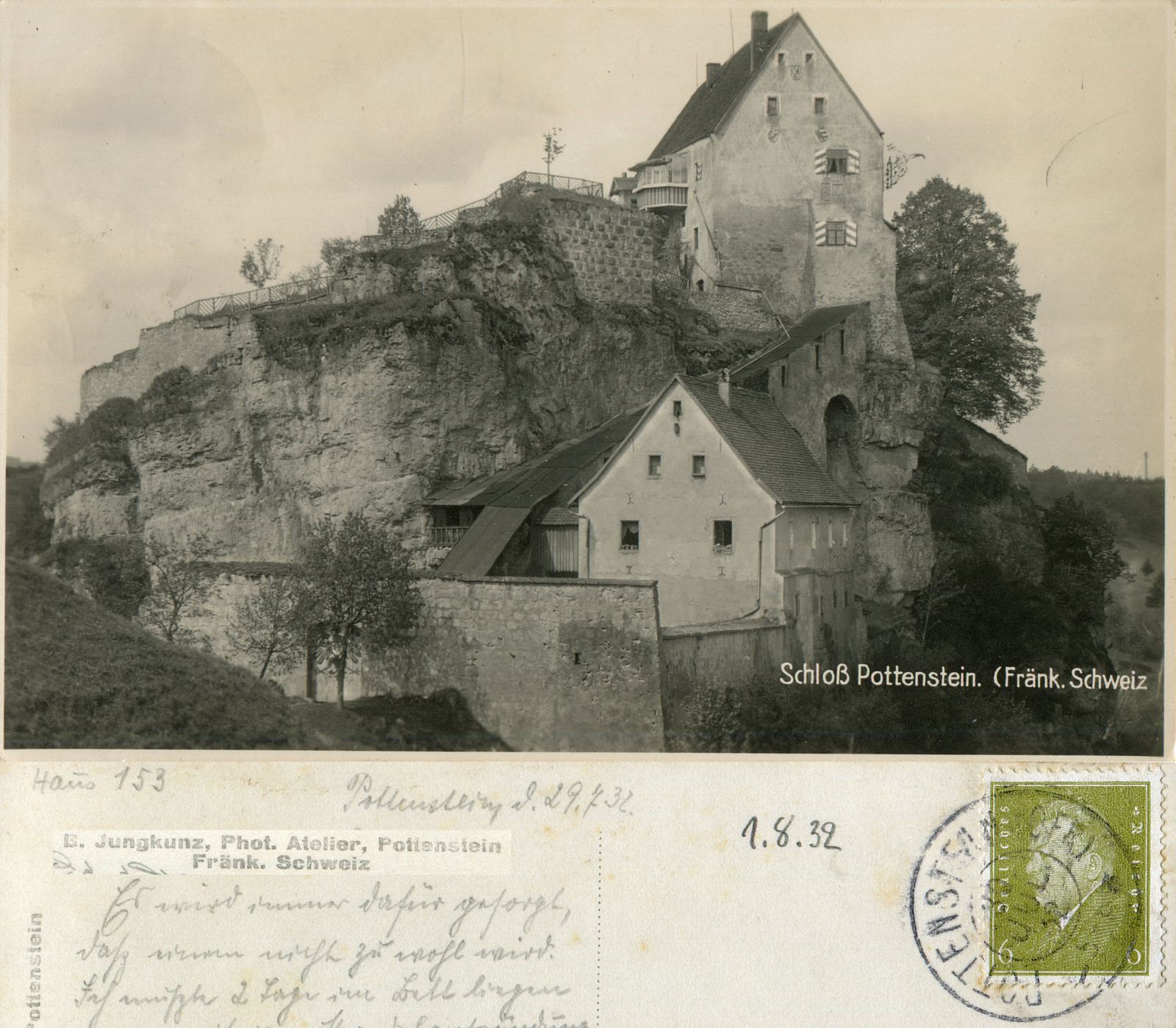 Die Ansichtskarte ist am 07.08.1940, einem Mittwoch, von Pottenstein nach Ellefeld ins Vogtland gelaufen. Von „Günther + Rolf“ an ihre Eltern: „Wir halten es hier aus! Das Essen ist prima und auch das Wetter.“ Frankiert mit einer 6 Pfennig Hindenburg-Dauermarke, Michelnummer 484/516.