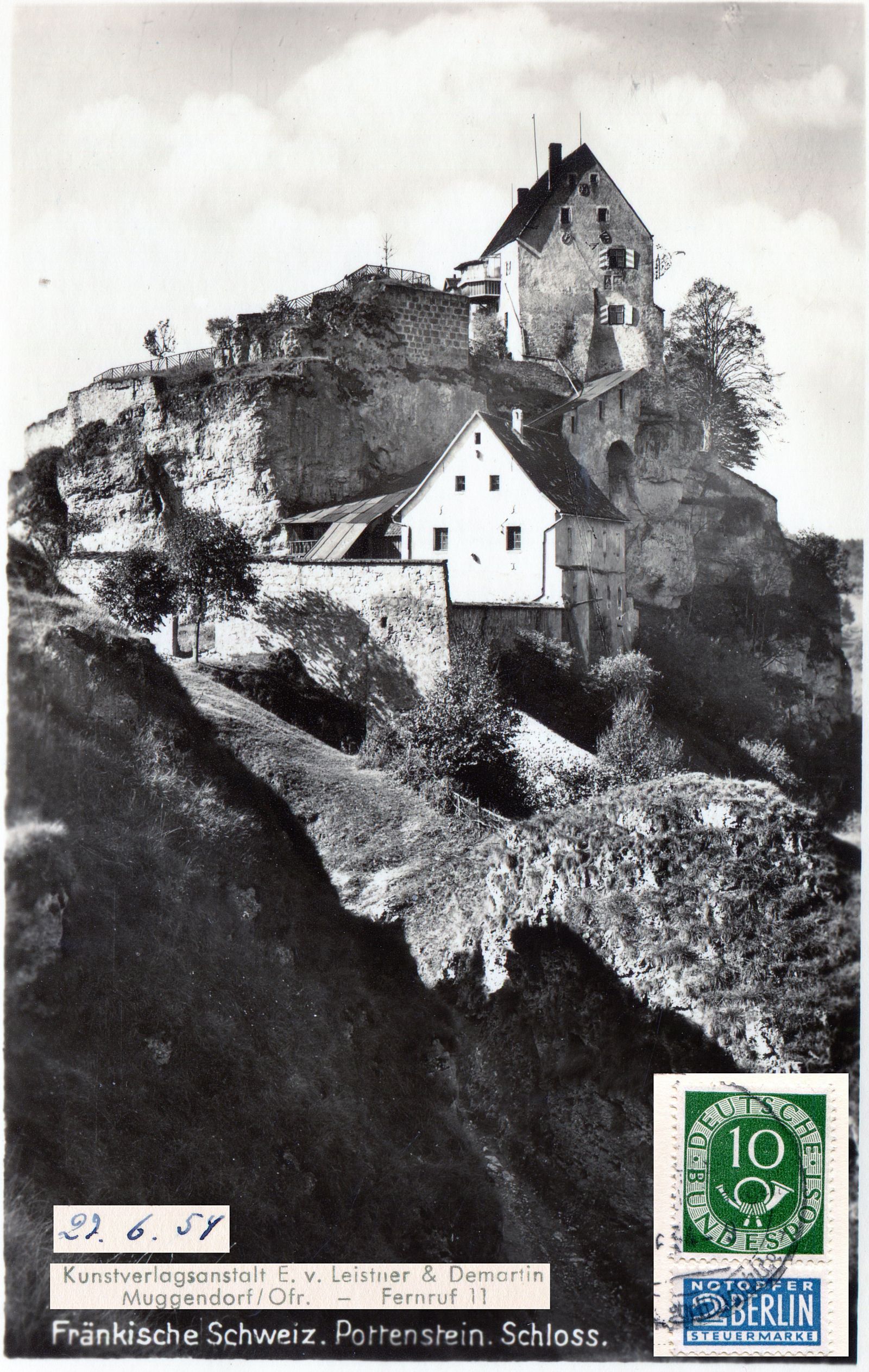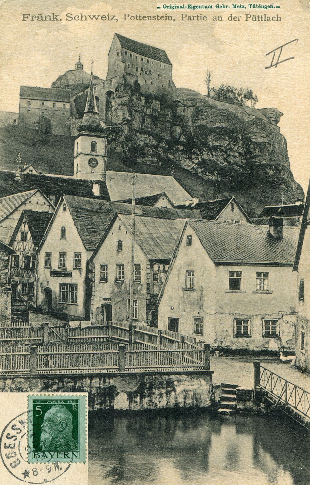 Hier ebenfalls noch eine Ansichtskarte mit Marke, vermutlich Michelnummer 77 aus 1911, postalisch gelaufen 1913 mit Stempel der nahegelegenden Stadt Goessweinstein (Gößweinstein), mit dem ähnlichen Motiv wie auf der Handzeichnung: