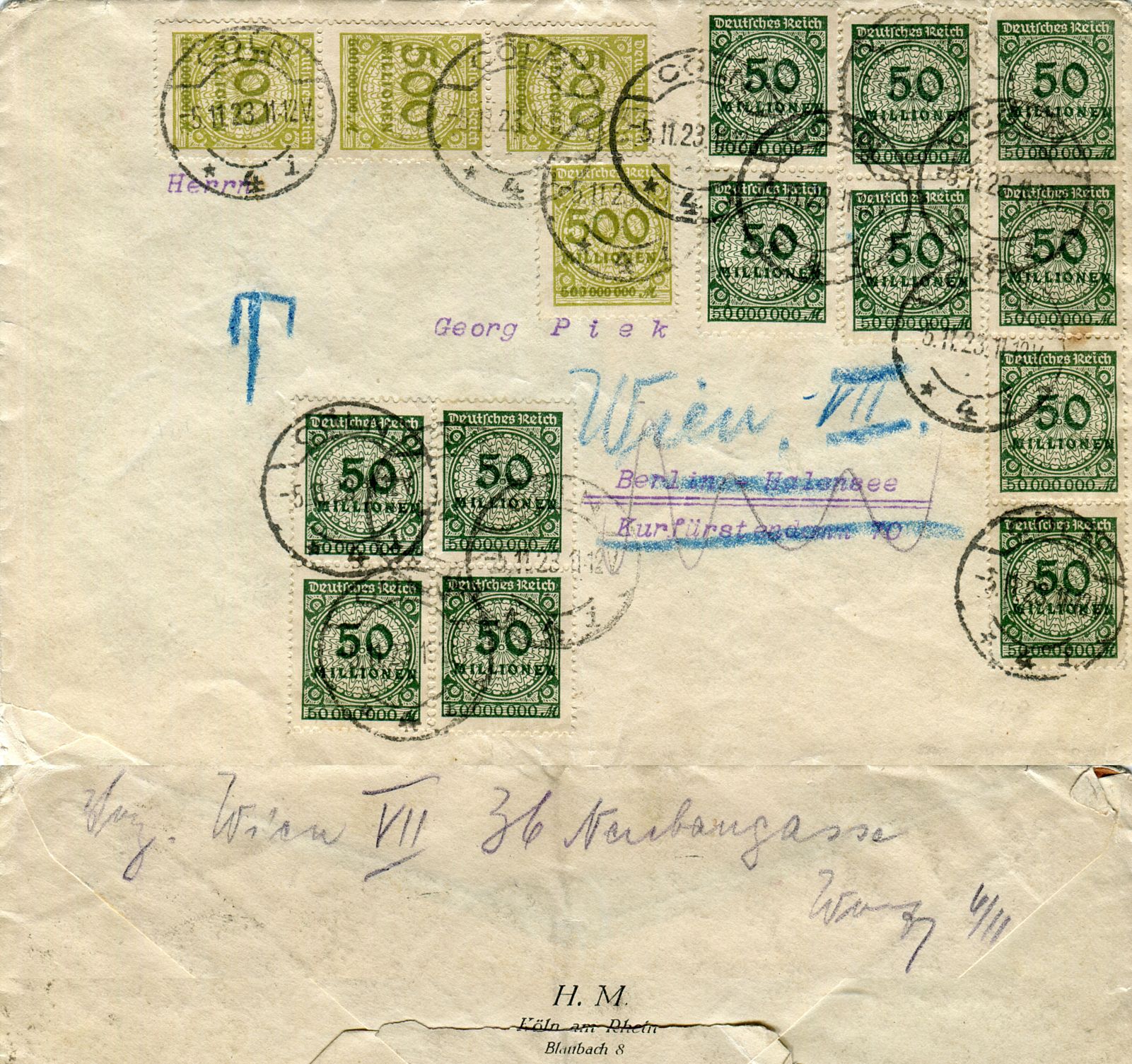 Brief an Georg Piek in Berlin-Halsensee, Kurfürstendamm 70. Der Brief wurde am 05.11.1923 verschickt, also zur Endzeit der Hyperinflation, jedoch (vermutlich von Berlin) nach Wien VII, 36 Neubaugasse, Wohnung 6/II, weitergeleitet. Hierbei handelt es sich um das Gebäude des damaligen Renaissancetheater.
