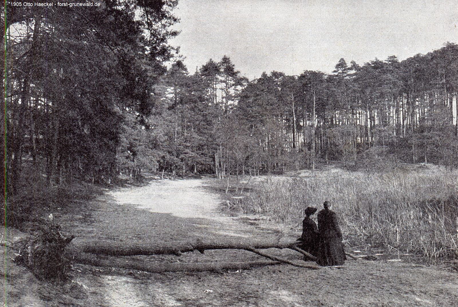 “Nördlich von diesem anmutenden Plätzchen (gemeint ist “Vier Eichen”) verbreitert sich der Grunewaldgraben allmählich zu einem weiten Thalkessel, der, durch das Gehege der Saubucht dem Besuch entzogen, an seiner tiefsten Stelle den vom Sumpf umgebenen, in 102 Fuß Meereshöhe gelegenen Barschsee enthält. In fast gleicher Breite setzt die Senke sich nach Norden zum Pechsee fort, dessen Umgebung reich an kleinen, eine interessante Flora bergenden Torfpfuhlen ist, und bildet dann nach kurzer Verengung das breite Thal des Teufels- und Postfenns.“
