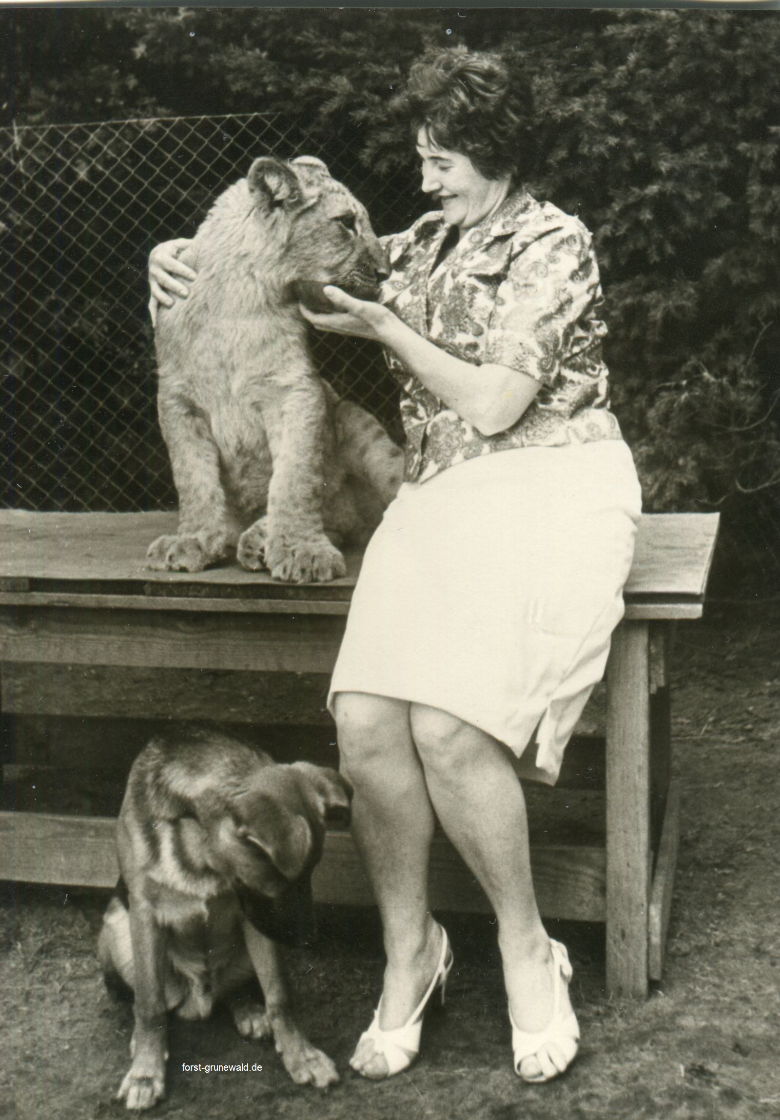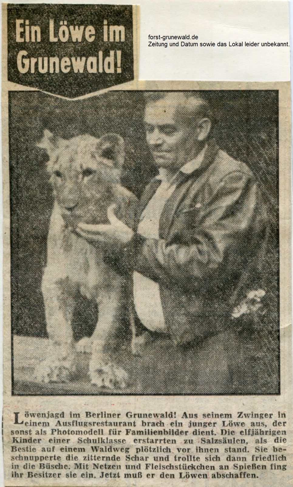 Das Ausflukslokal und die Zeitungsquelle/Datum ist mir leider unbekannt. Anhand der Qualität vermute ich die 60iger oder aber auch die 80iger Jahre. Auch ist unklar, ob sich das Lokal wirklich „im Grunewald“ oder lediglich in der „Kolonie Grunewald“ befand. Der Artikel und die beiden Bilder stammen aus einem Nachlass. Ich vermute, dass die Dame auf dem Bild das Lokal besucht hat und ihr dann später der Zeitungsartikel in die Hände gefallen ist und sie in den zu ihren eigenen „Löwenbildern“ als Erinnerungserweiterung genommen hat (übrigens sauber verklebt auf Pappe). Anhand der Aufmachung und des Schreibstils könnte der Artikel aus der BZ sein? Schade, dass das Lokal und der Name des Besitzer/Wirts (vermutlich der Herr im Artikelbild) nicht genannt wurden und im Artikel kein Datum abgedruckt ist.